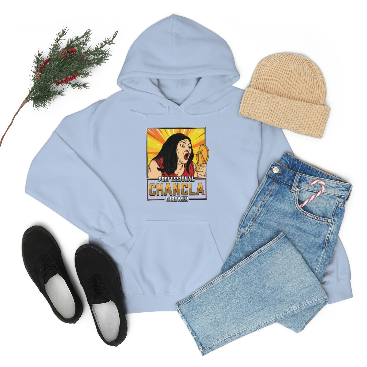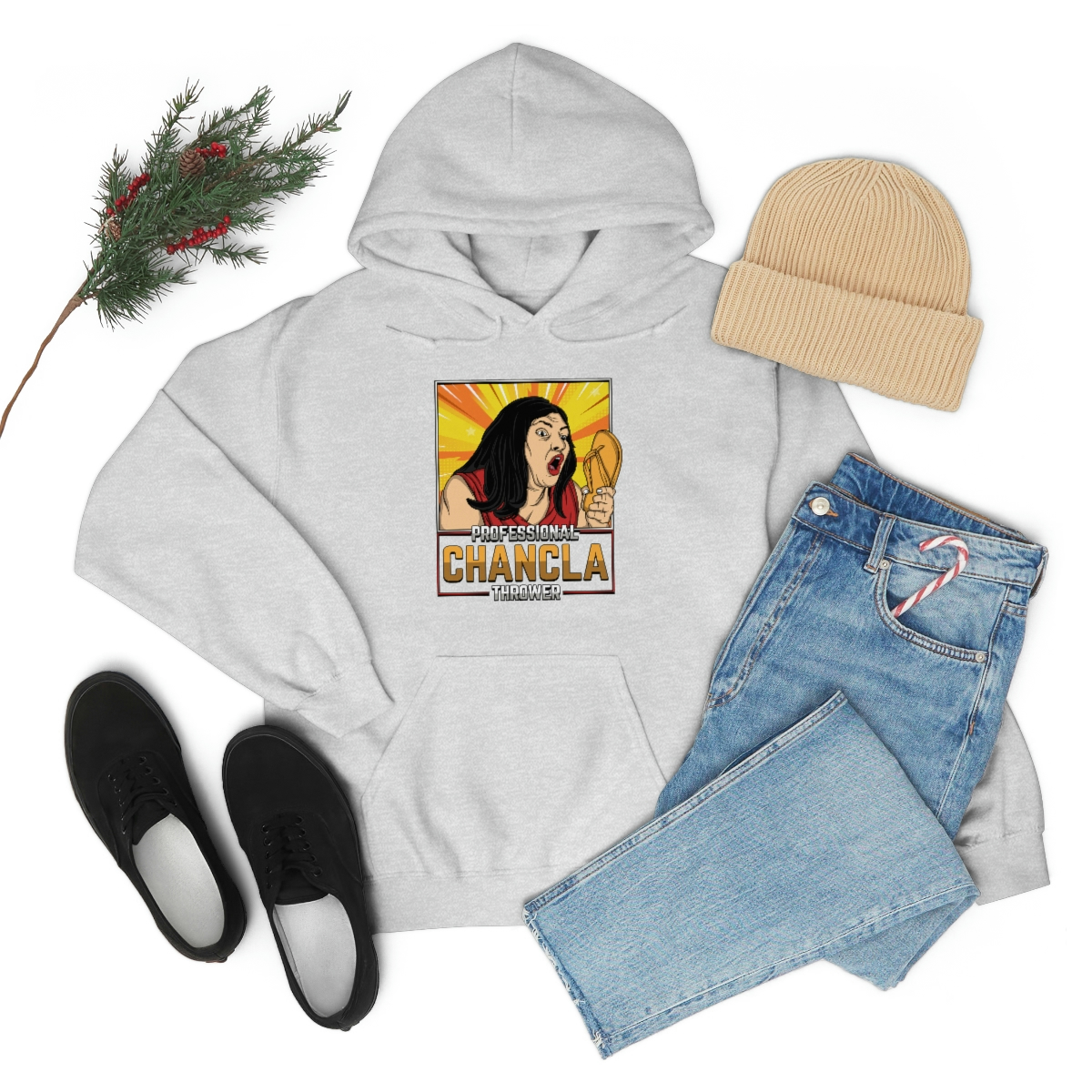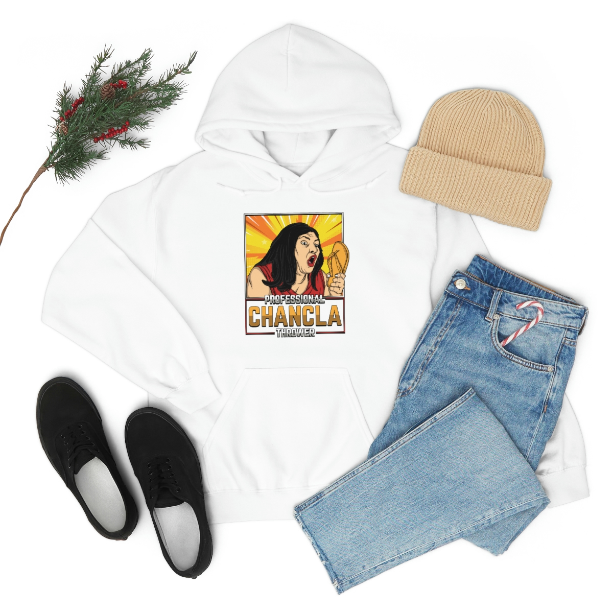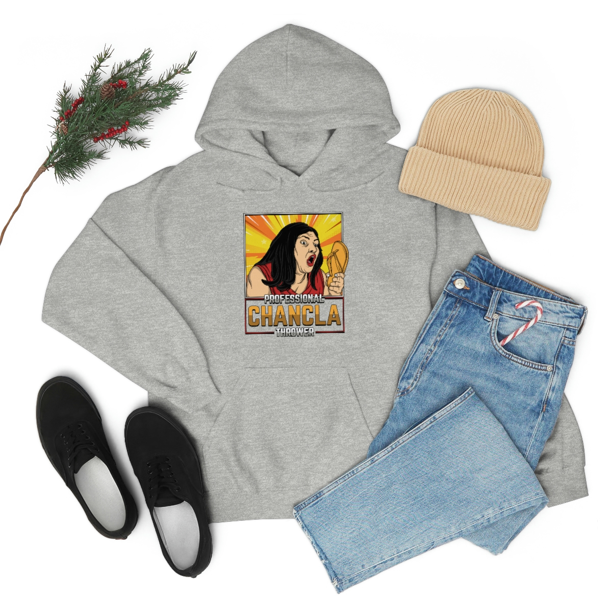 Made from a comfortable blend of cotton and polyester, this sweatshirt is perfect for keeping you warm during those chilly evenings when you’re practicing your chancla-throwing skills. With its bold and eye-catching graphic on the front, featuring a pair of Chanclas and the words “Professional Chancla Thrower” in large, bold letters, you’re sure to turn heads wherever you go.