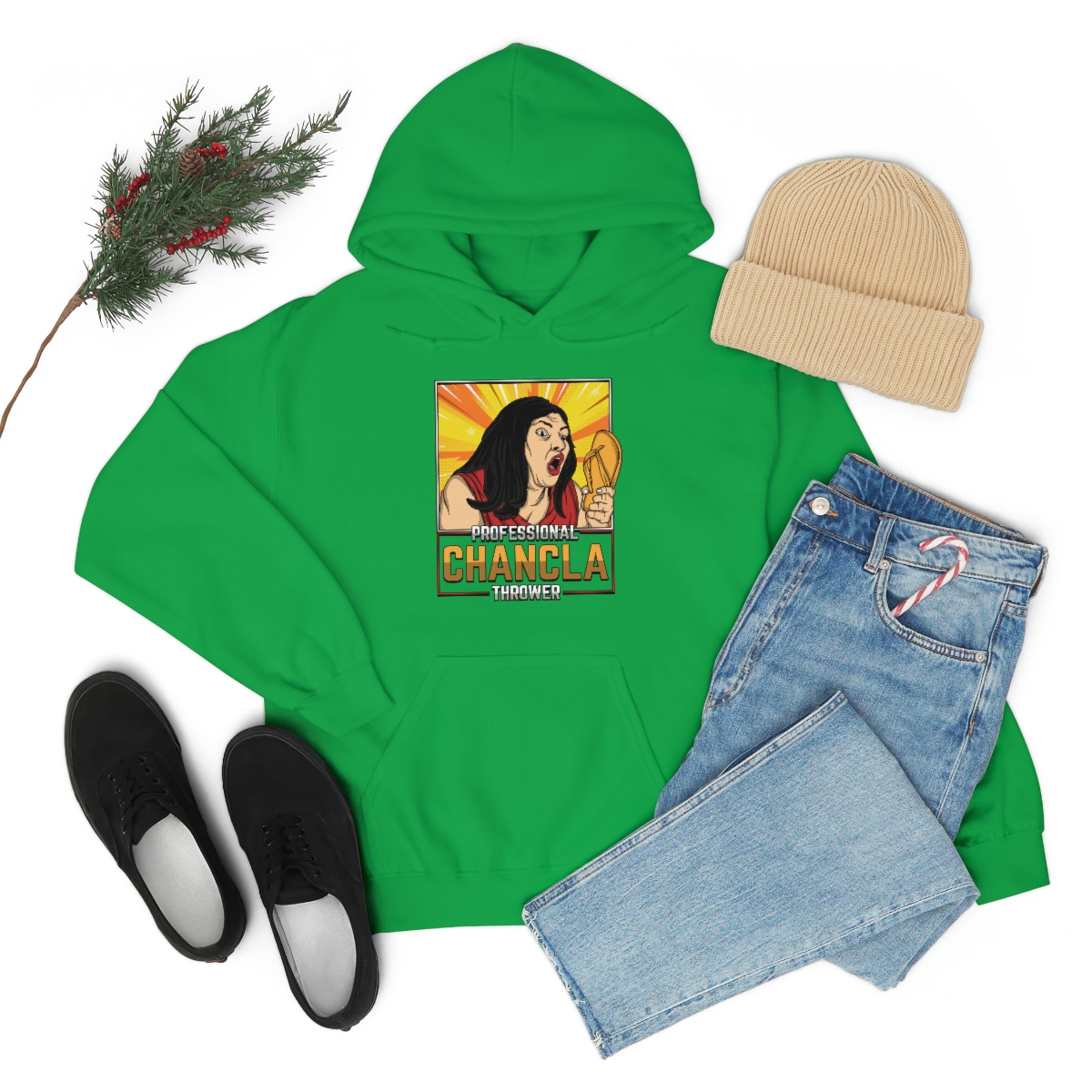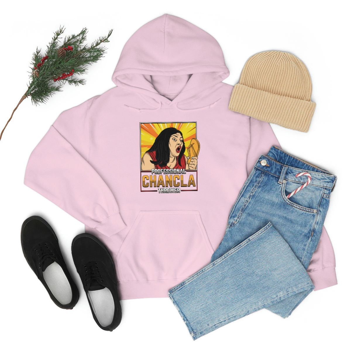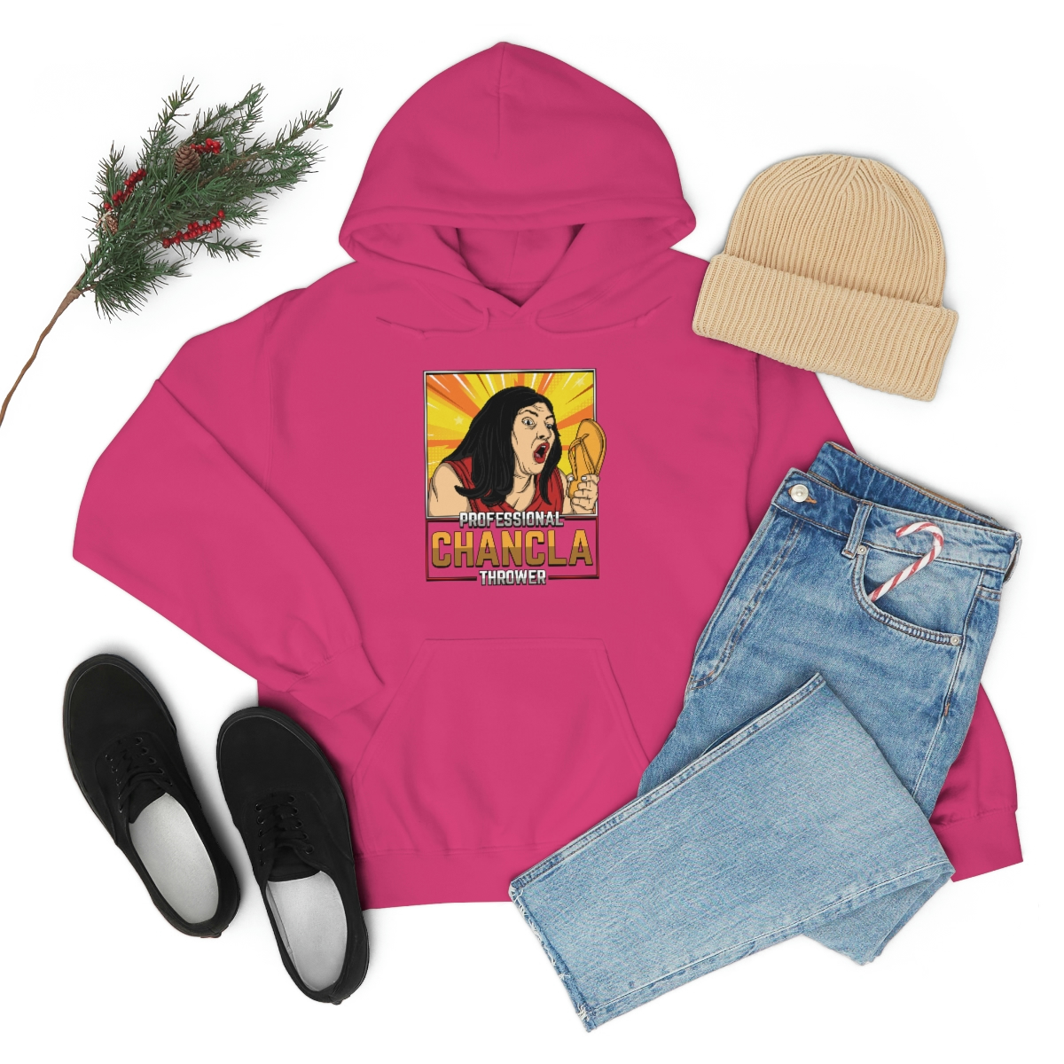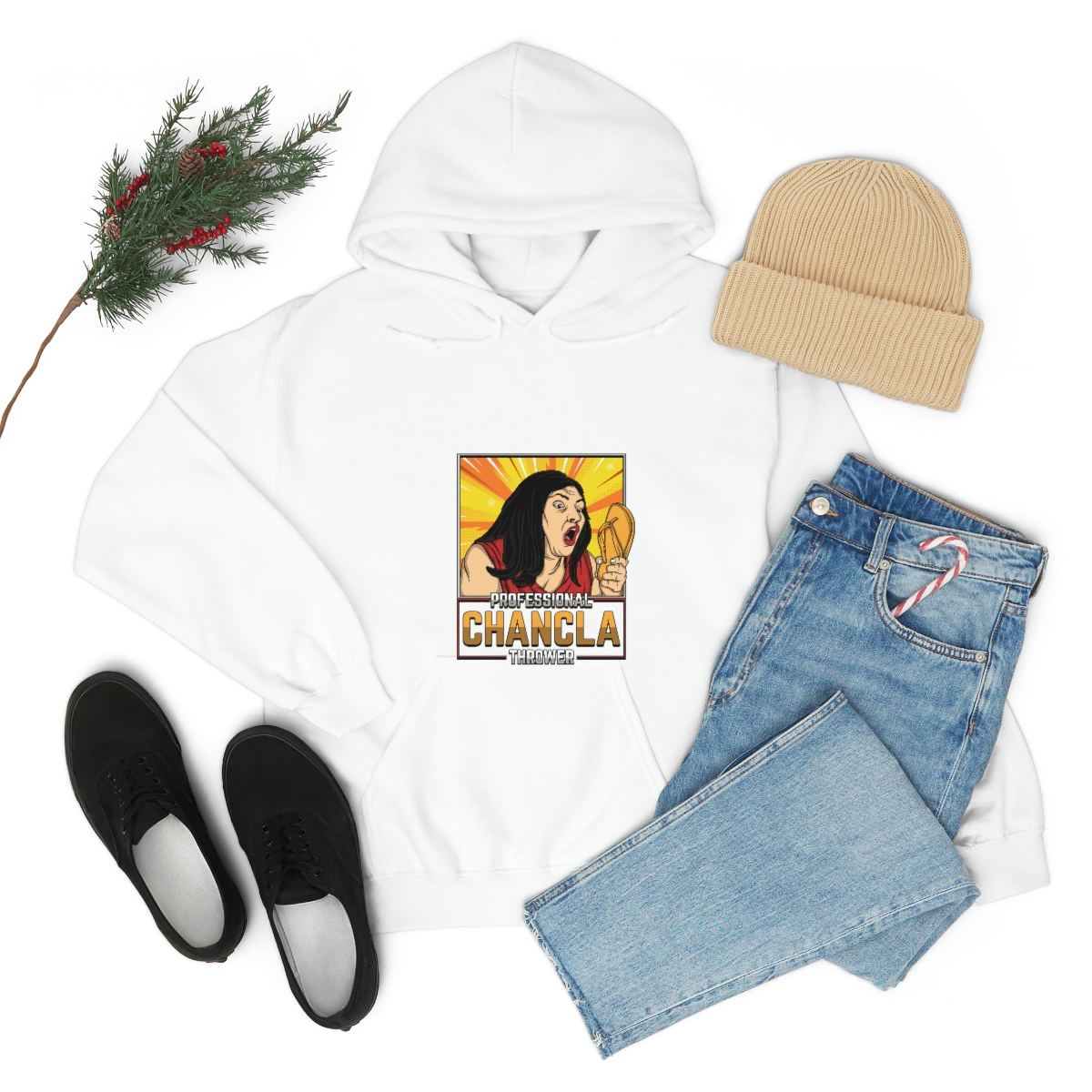 Made from a comfortable blend of cotton and polyester, this sweatshirt is perfect for keeping you warm during those chilly evenings when you’re practicing your chancla-throwing skills. With its bold and eye-catching graphic on the front, featuring a pair of Chanclas and the words “Professional Chancla Thrower” in large, bold letters, you’re sure to turn heads wherever you go.