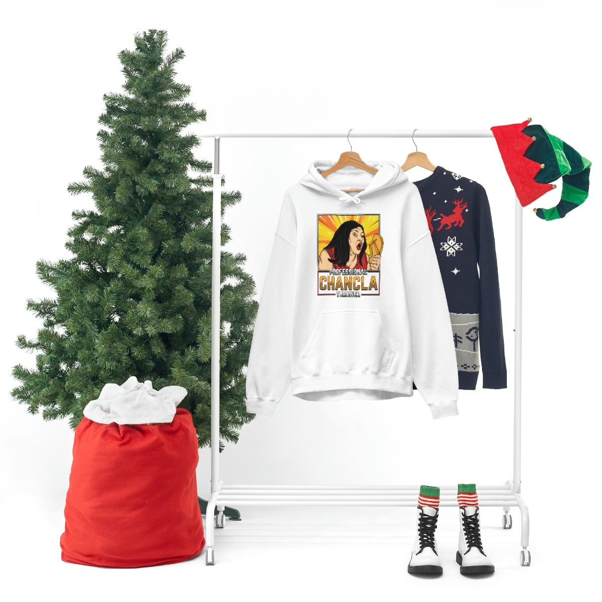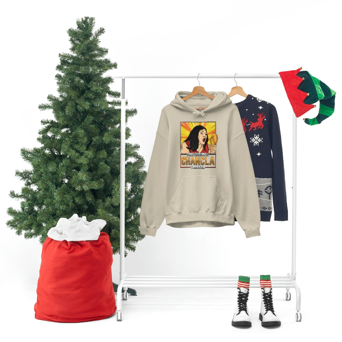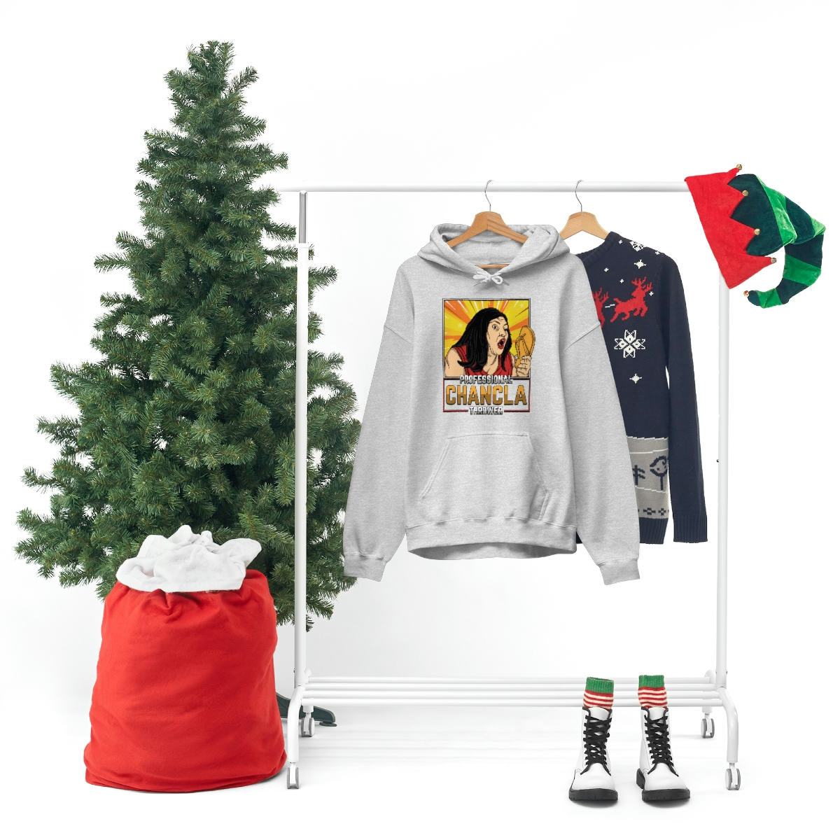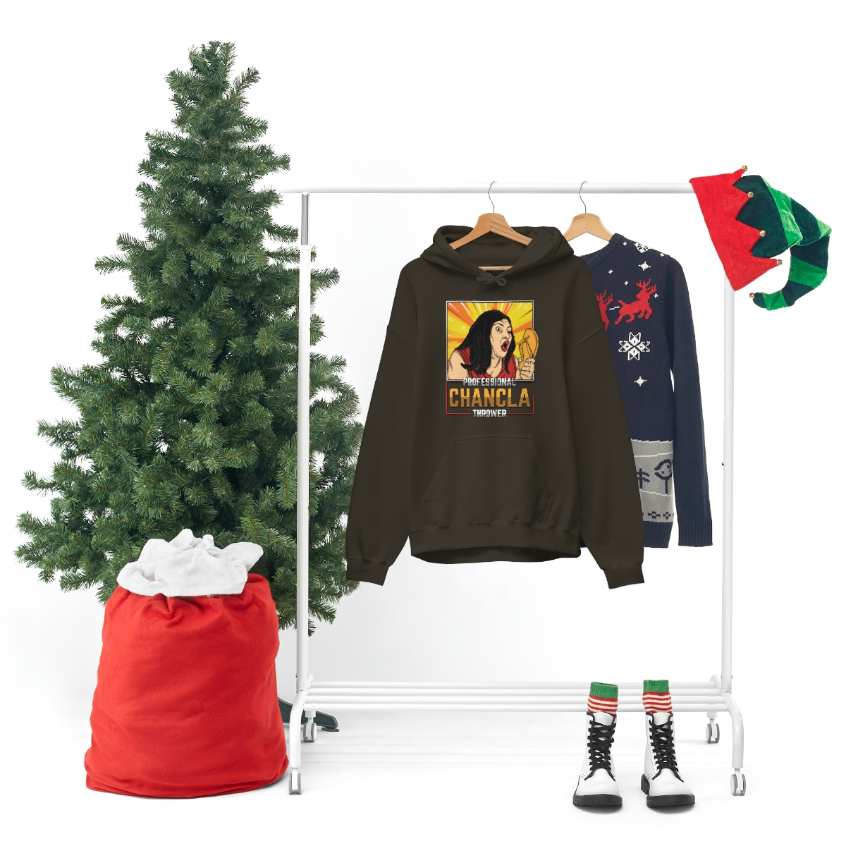 Made from a comfortable blend of cotton and polyester, this sweatshirt is perfect for keeping you warm during those chilly evenings when you’re practicing your chancla-throwing skills. With its bold and eye-catching graphic on the front, featuring a pair of Chanclas and the words “Professional Chancla Thrower” in large, bold letters, you’re sure to turn heads wherever you go.