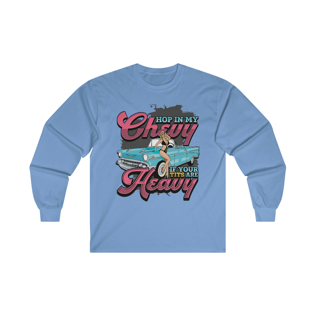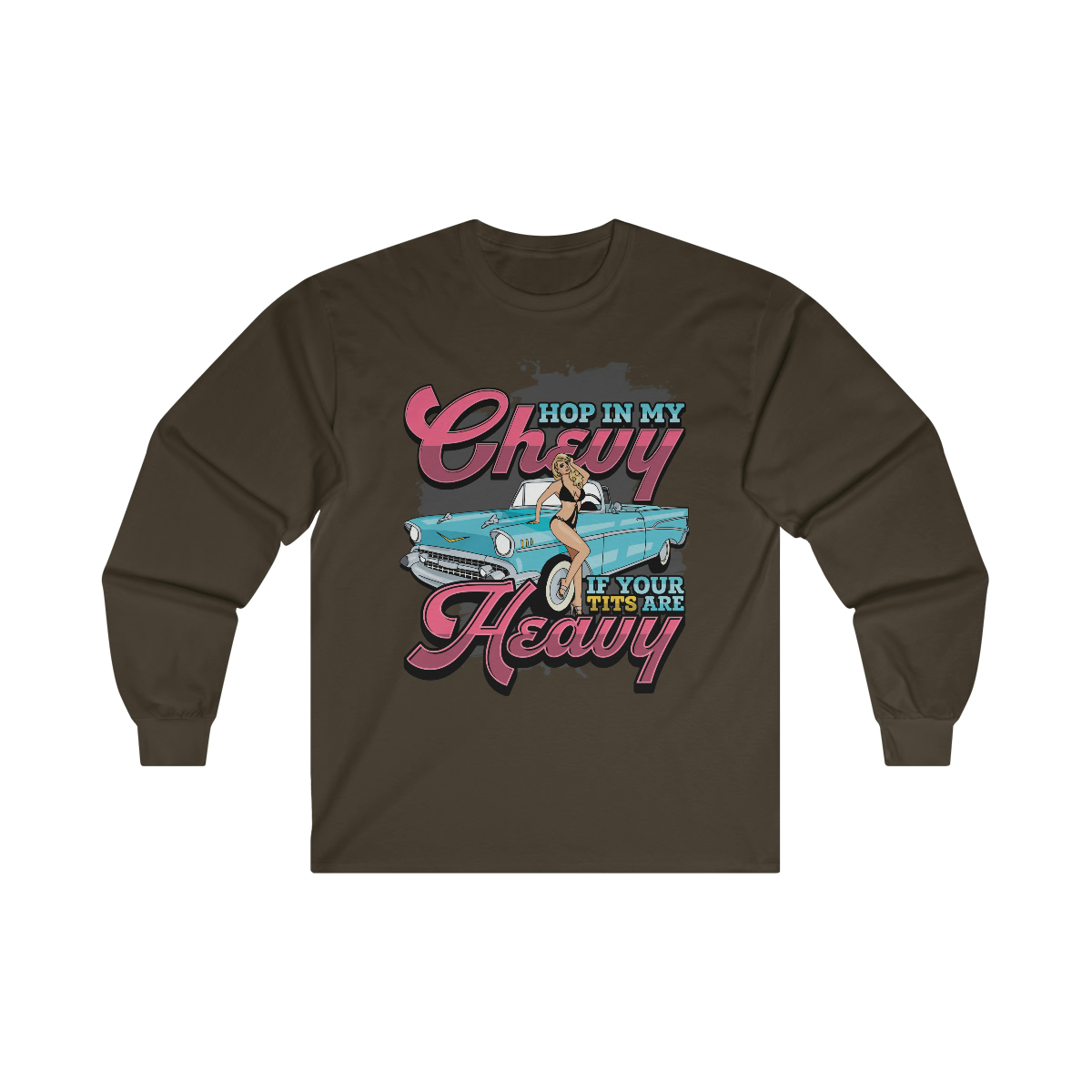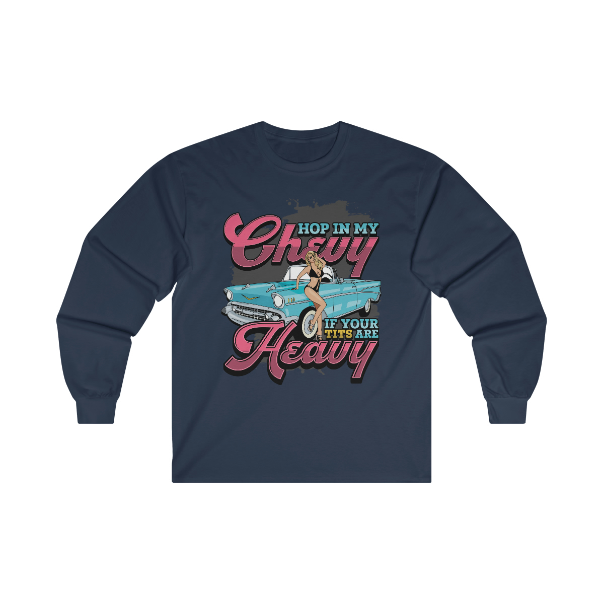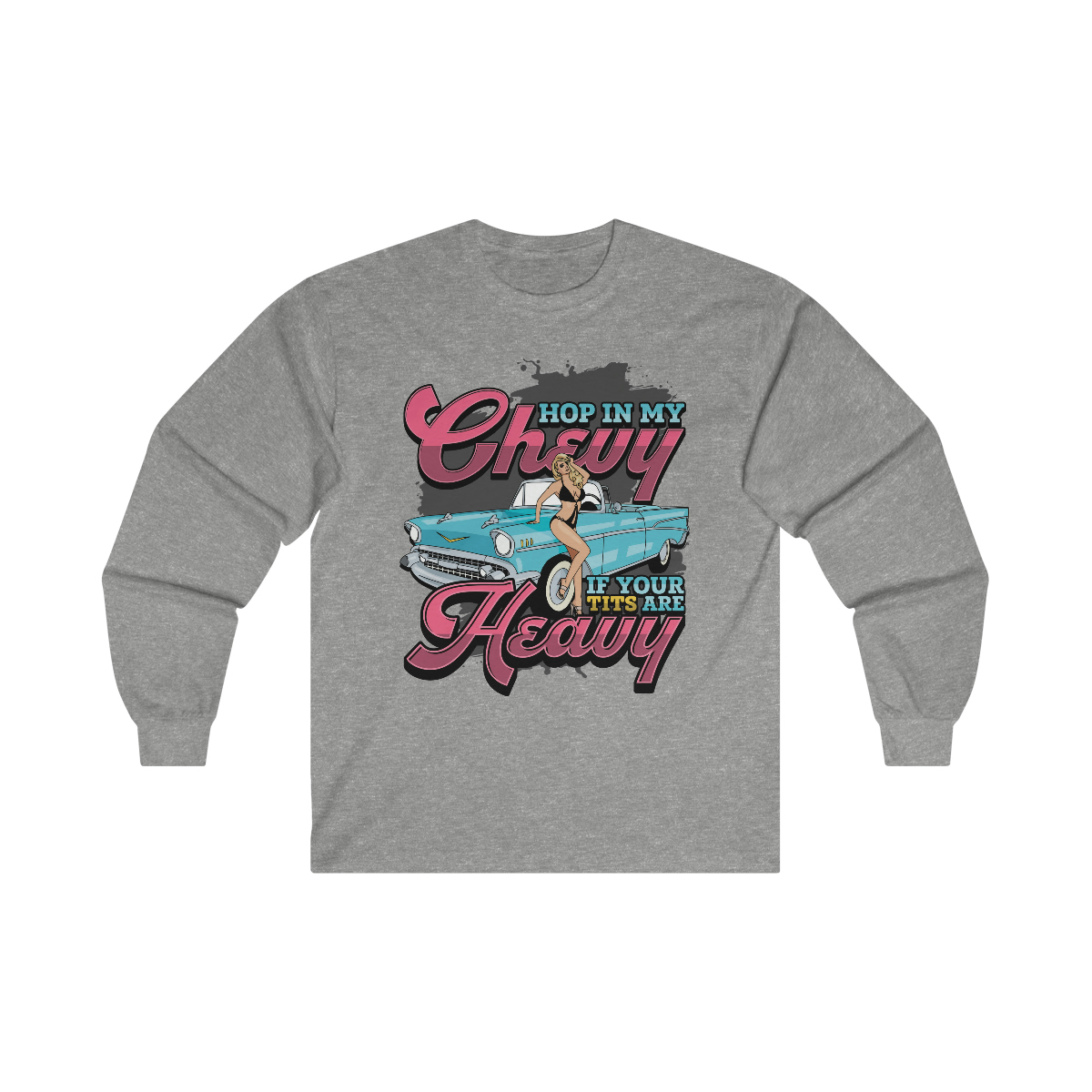 So, what are you waiting for? Hop in your Chevy and hit the open road in style with our Hop in my Chevy if your Tits are Heavy – Ultra Cotton Long Sleeve Tee. Order now and make a bold statement with your fashion!