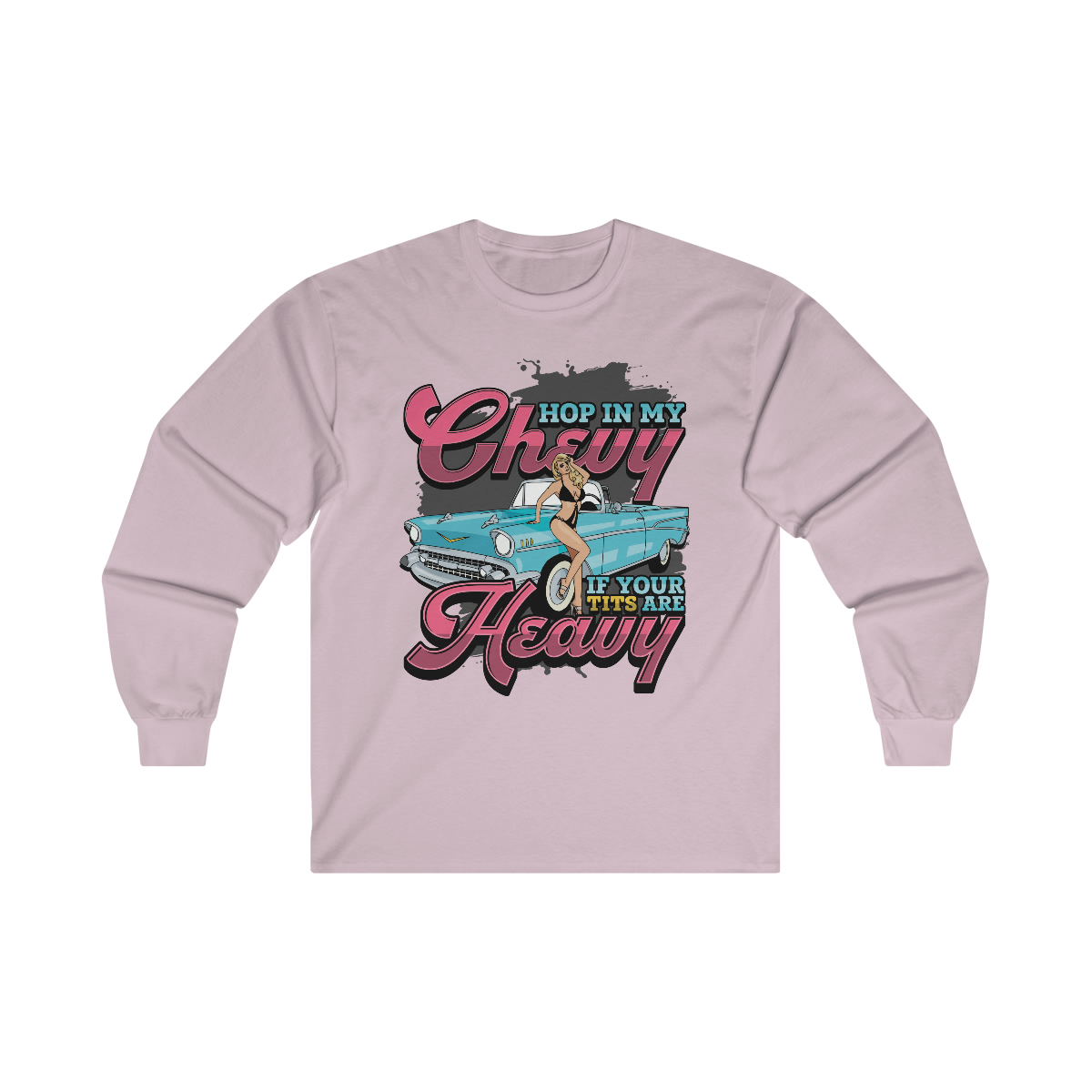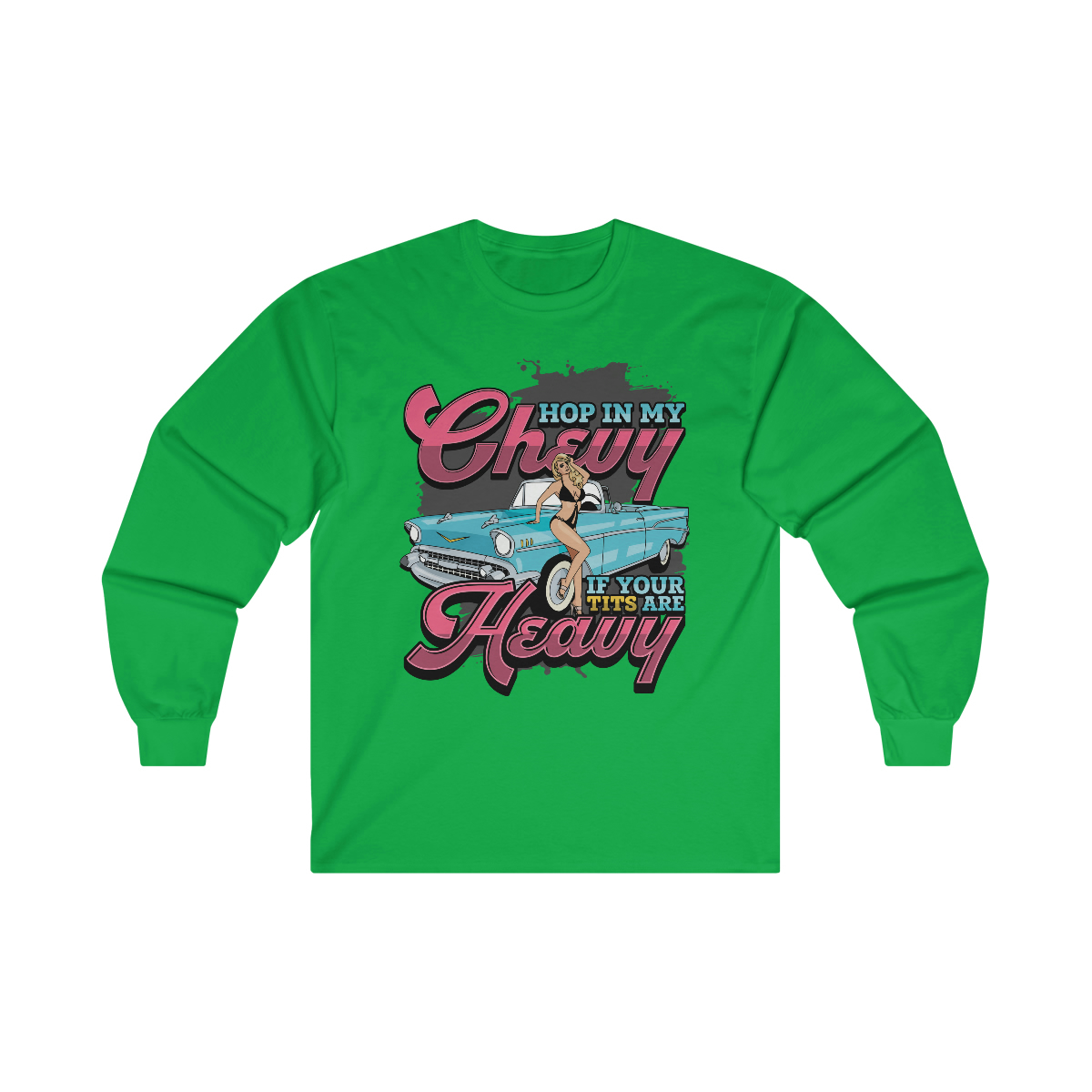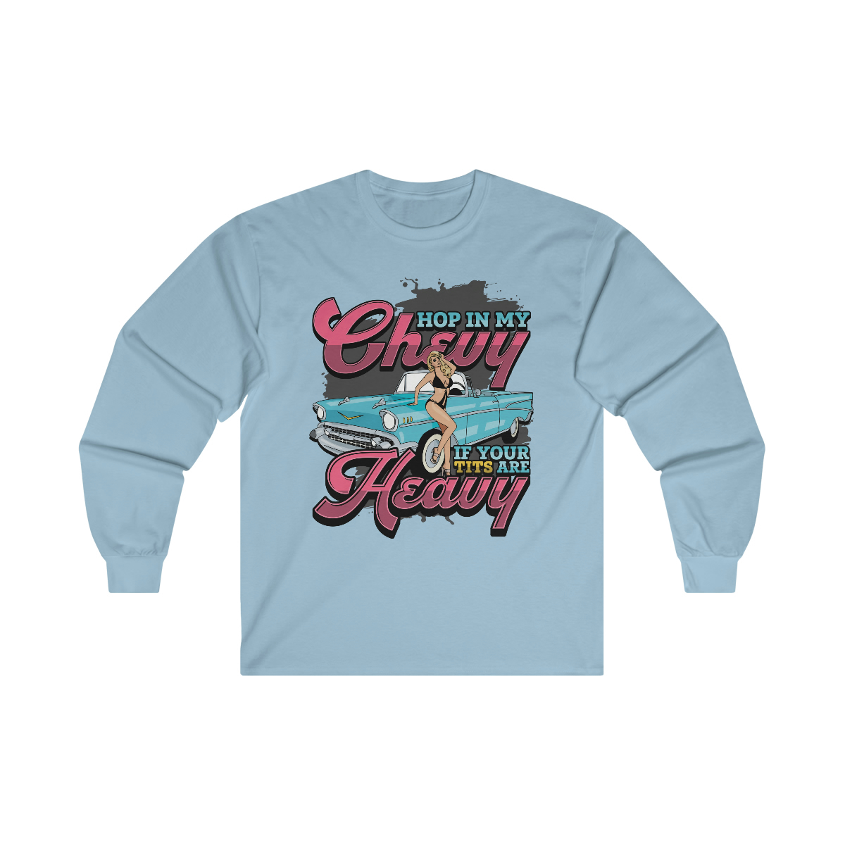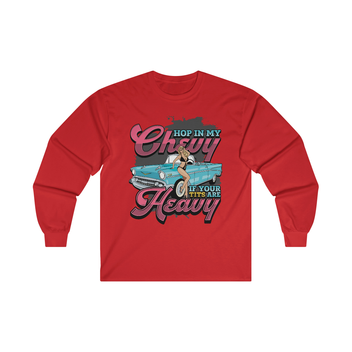 So, what are you waiting for? Hop in your Chevy and hit the open road in style with our Hop in my Chevy if your Tits are Heavy – Ultra Cotton Long Sleeve Tee. Order now and make a bold statement with your fashion!