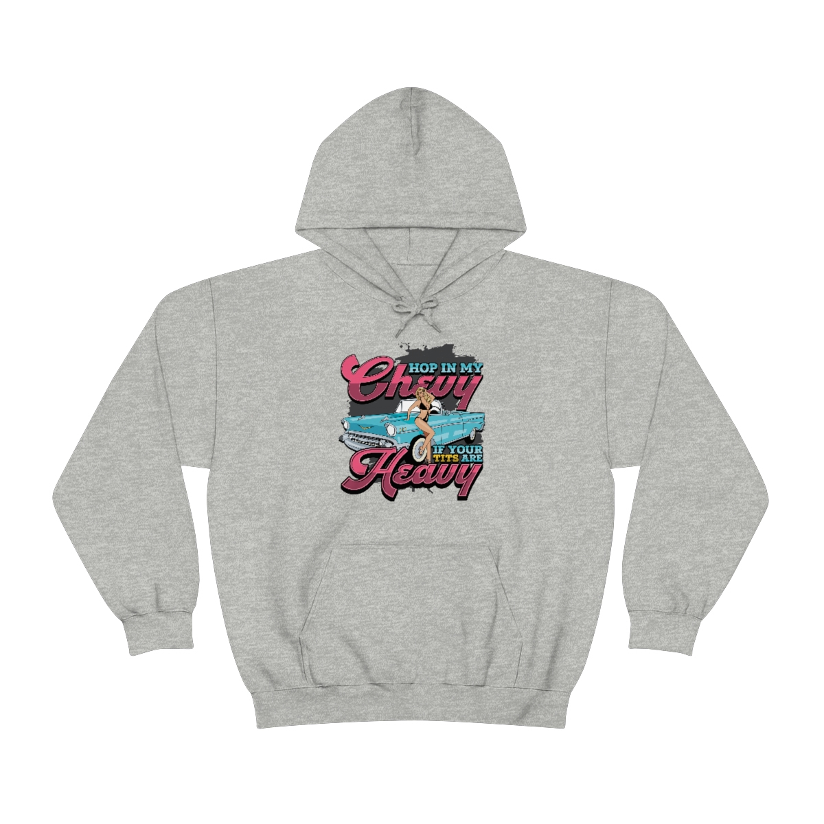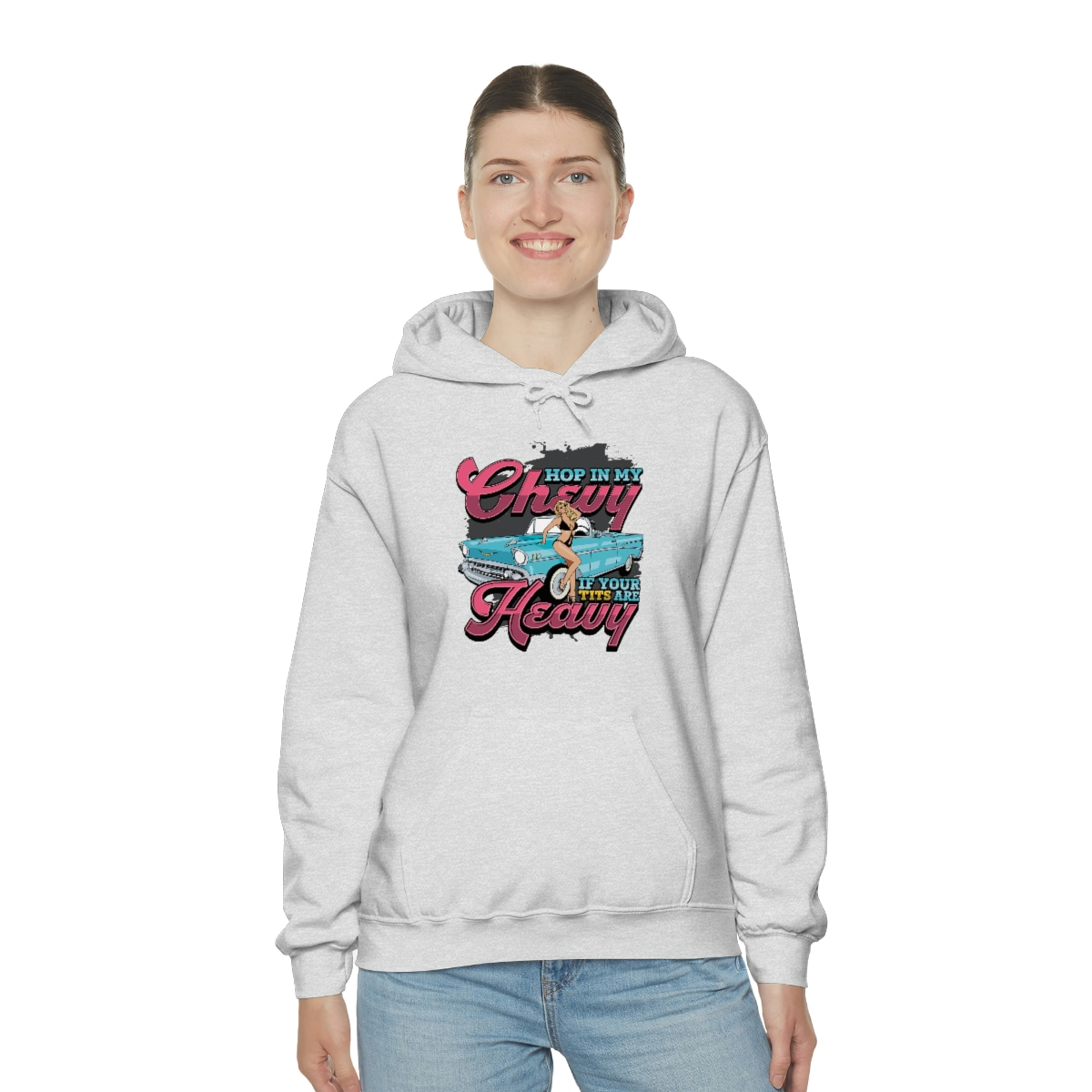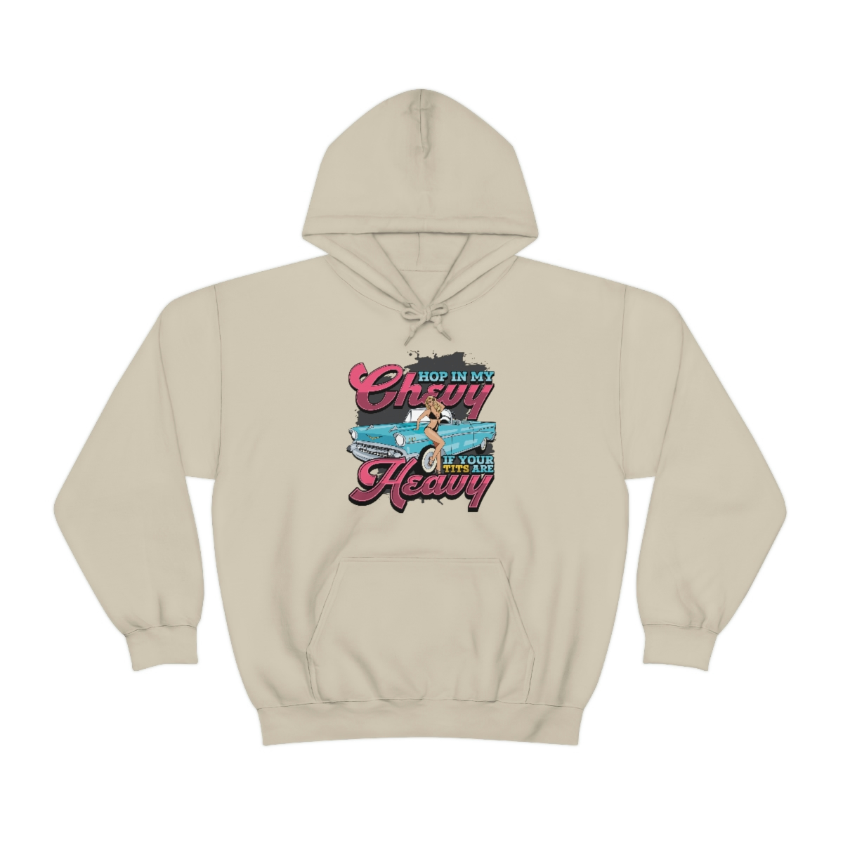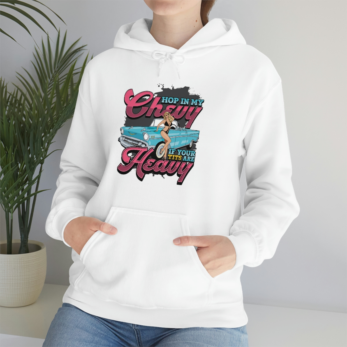 “Hop in my Chevy if your Tits are Heavy” Unisex Heavy Blend™ Hooded Sweatshirt