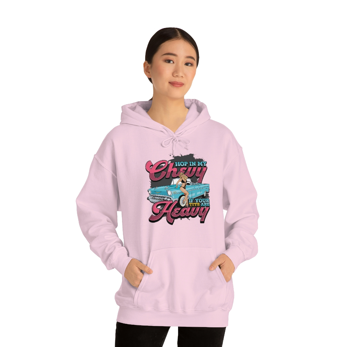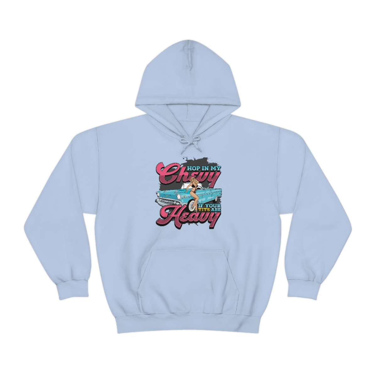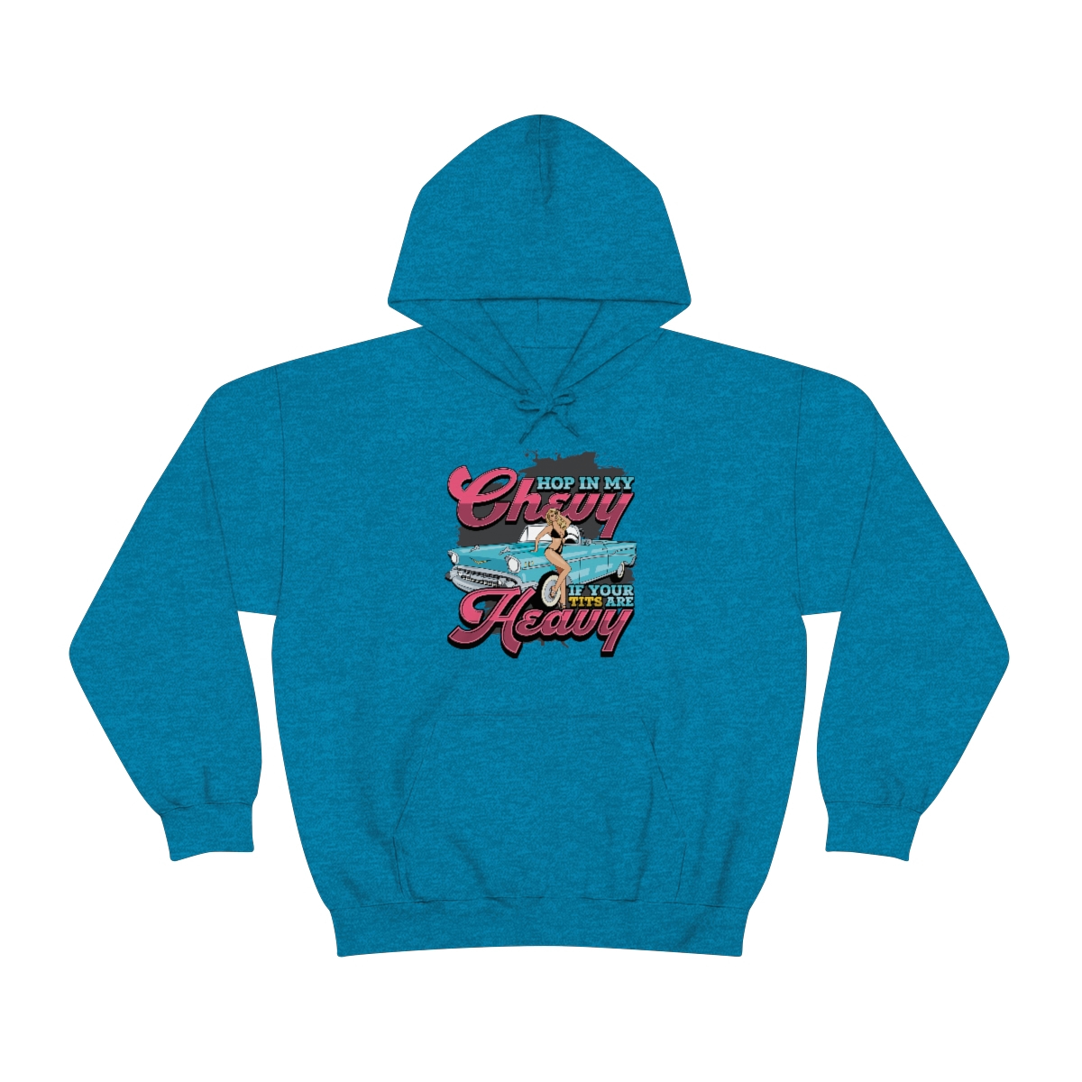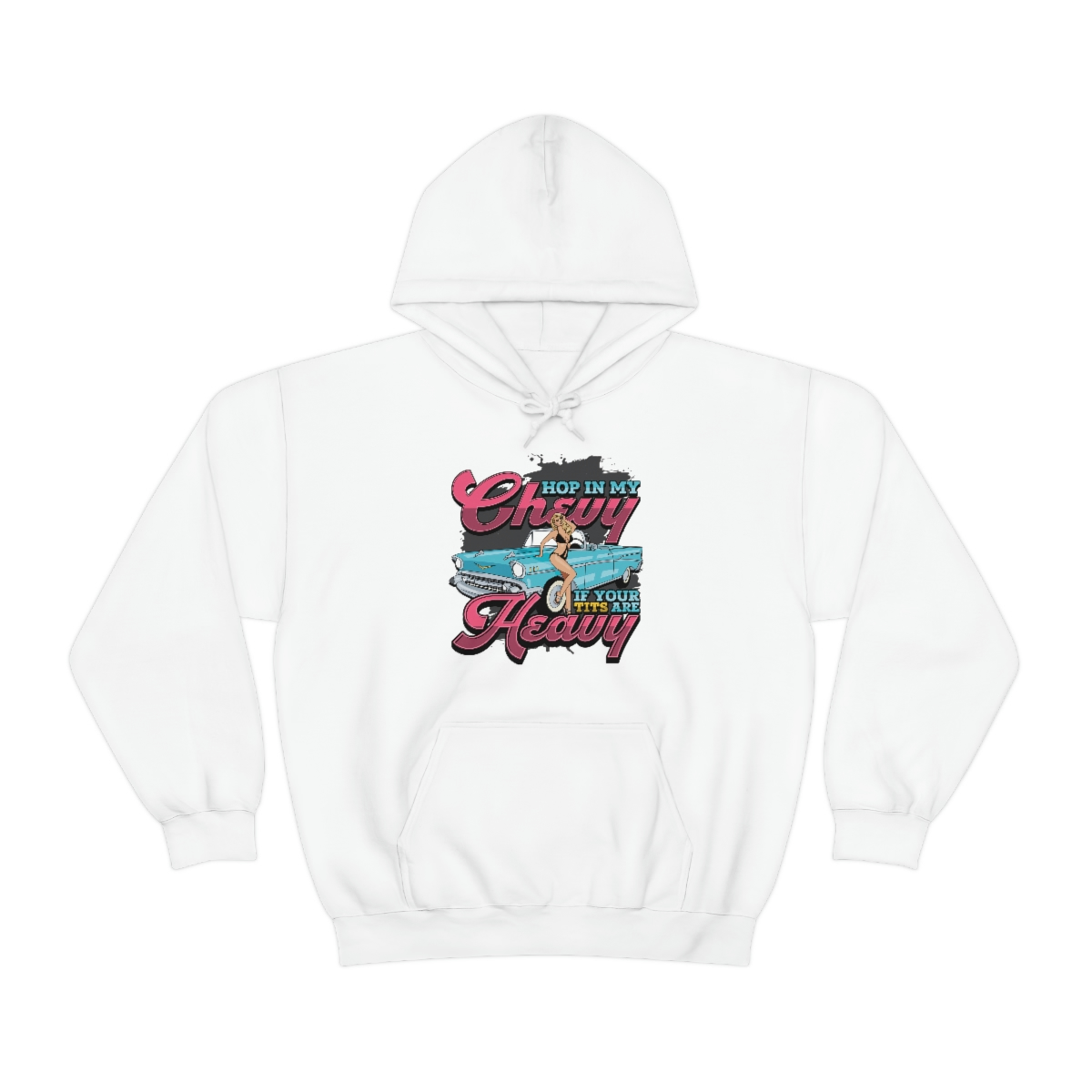 “Hop in my Chevy if your Tits are Heavy” Unisex Heavy Blend™ Hooded Sweatshirt