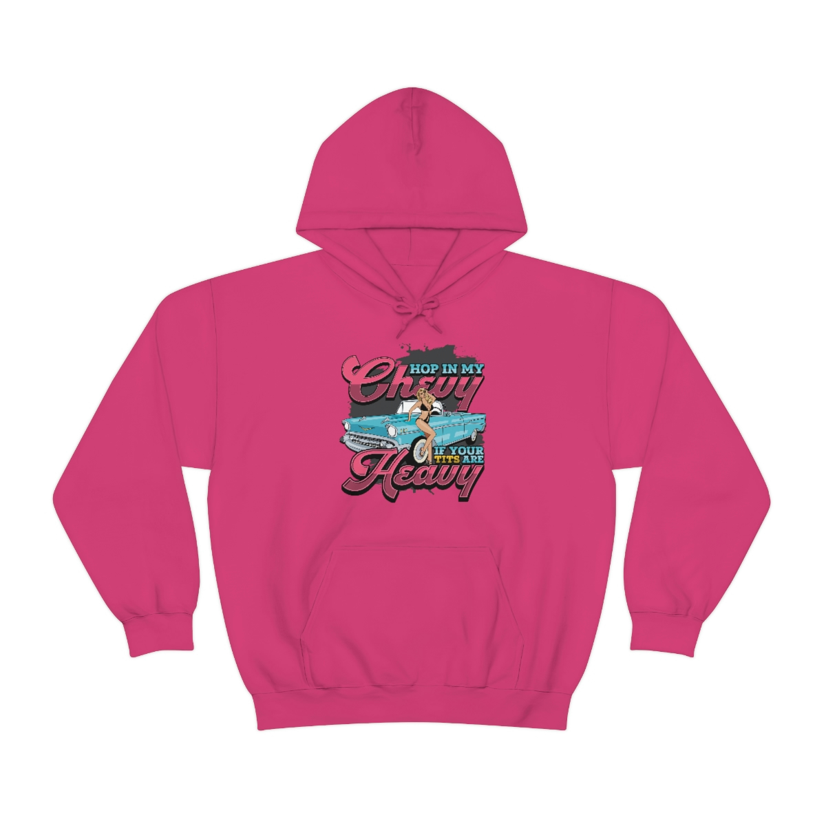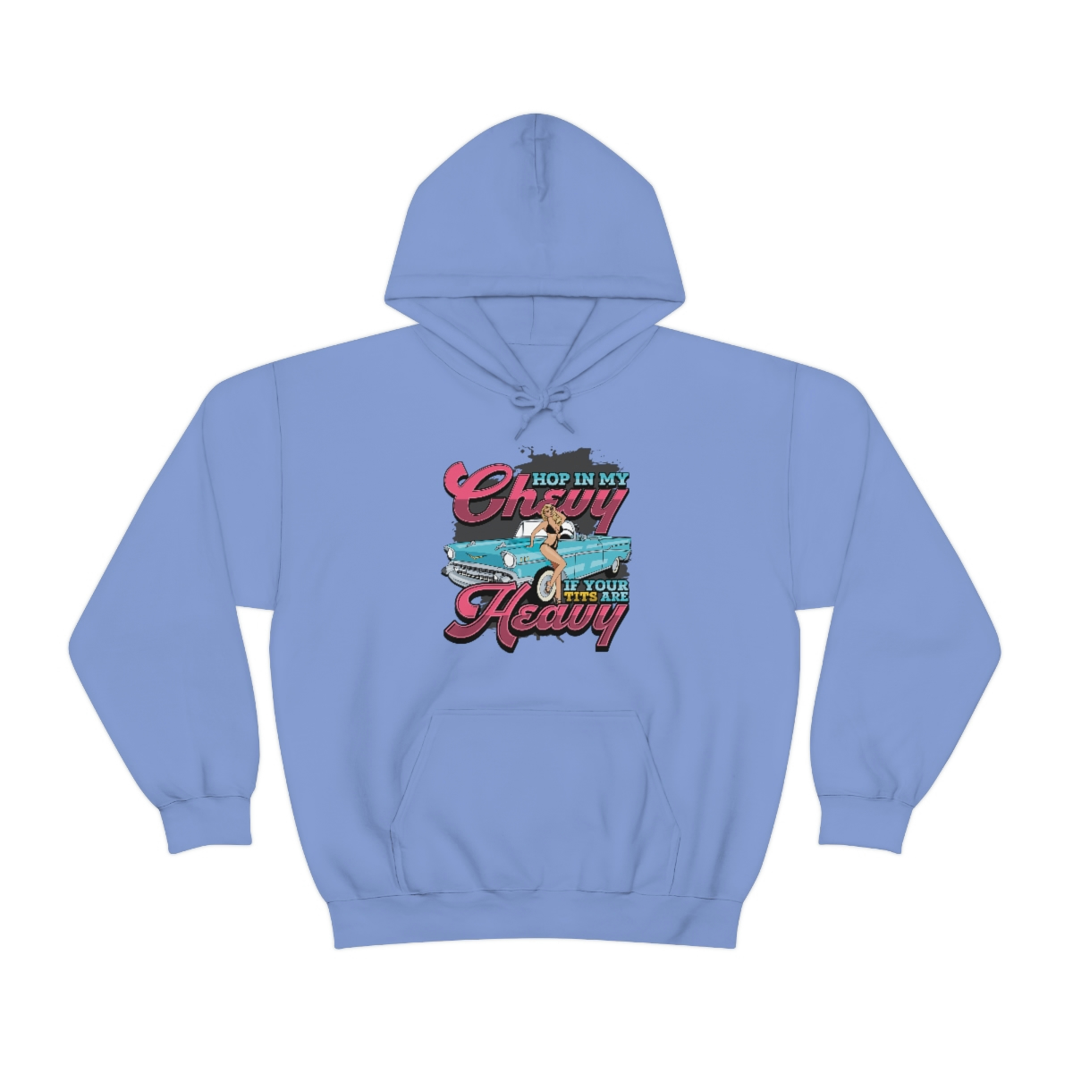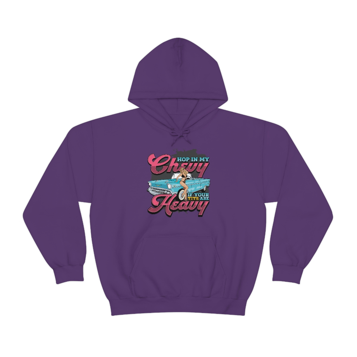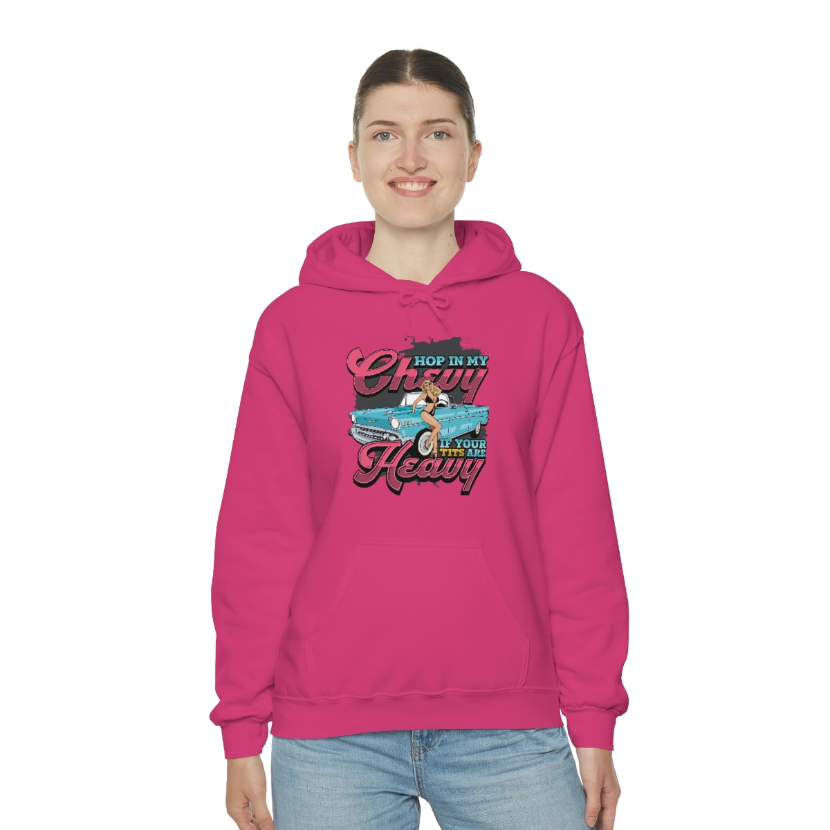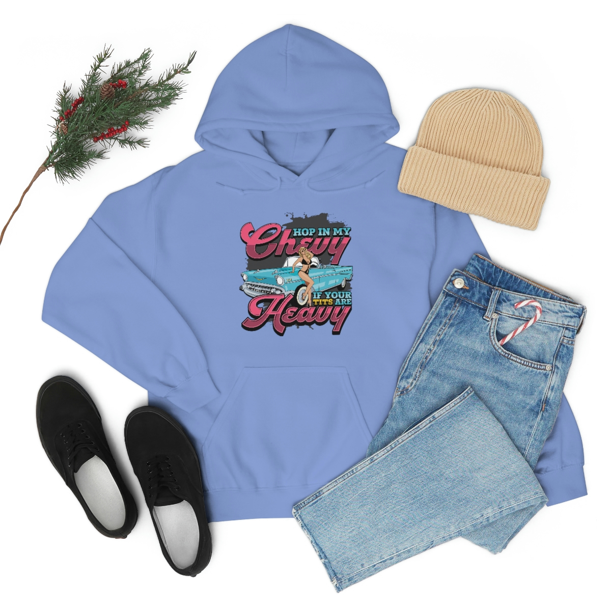“Hop in my Chevy if your Tits are Heavy” Unisex Heavy Blend™ Hooded Sweatshirt