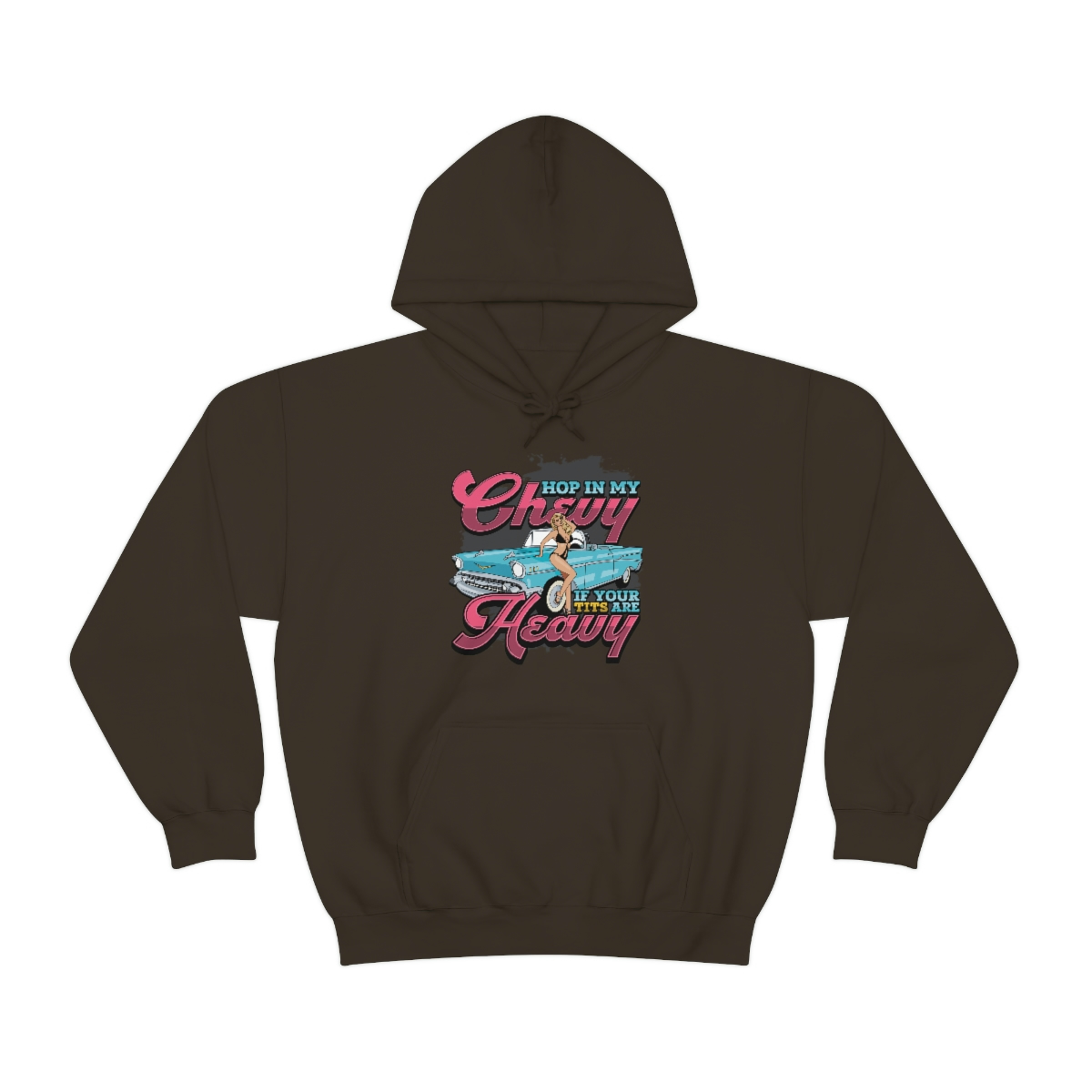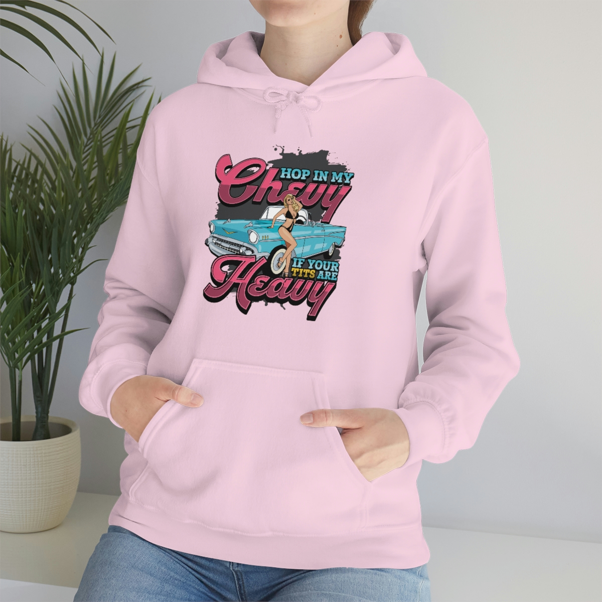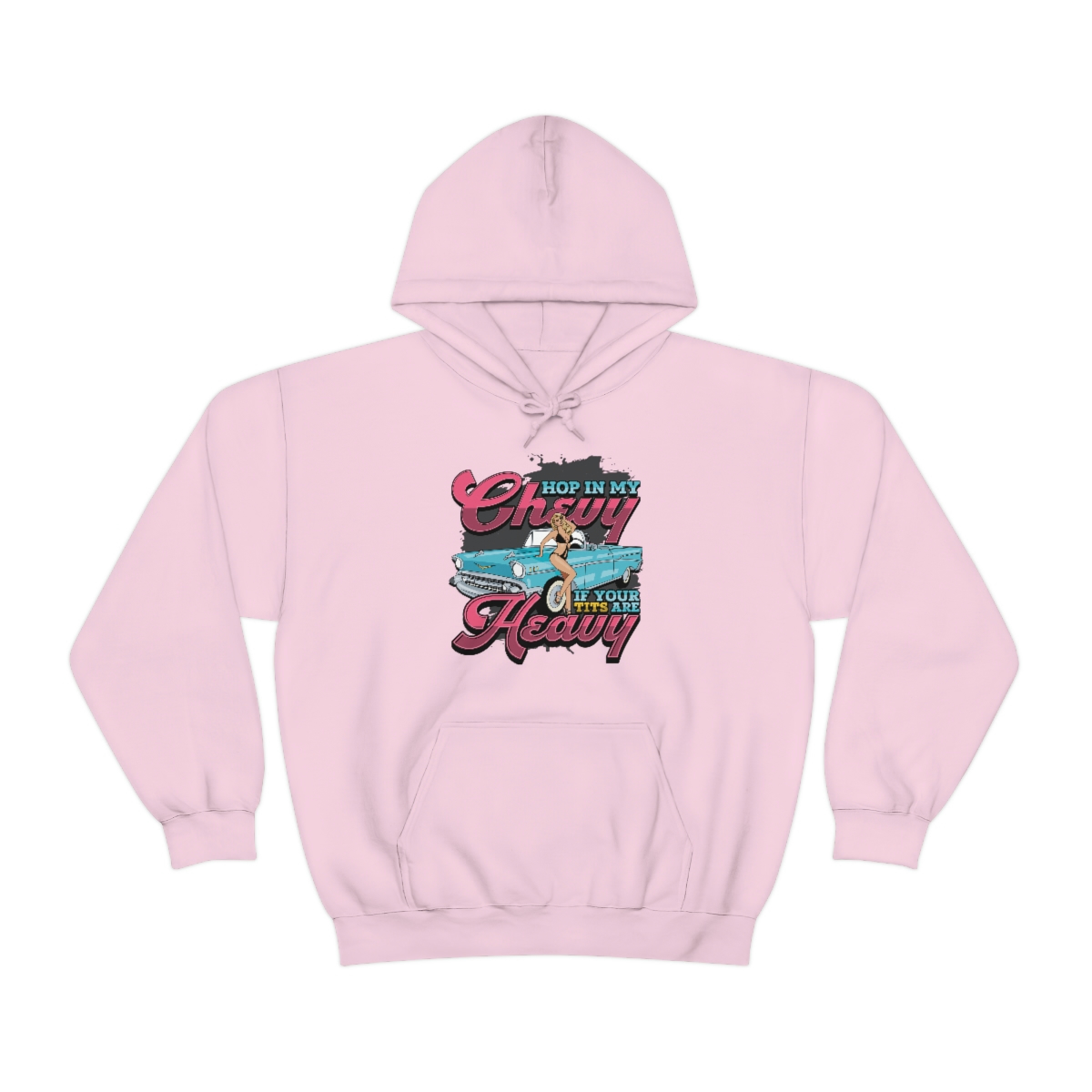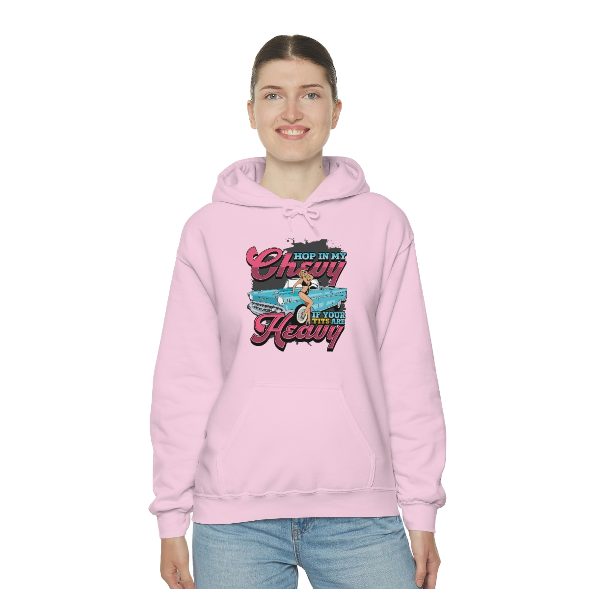 “Hop in my Chevy if your Tits are Heavy” Unisex Heavy Blend™ Hooded Sweatshirt